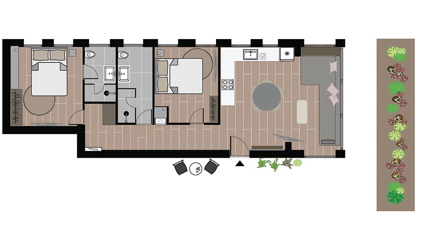 Our Two-Bedroom Apartment is situated on the ground floor of Mr. Carmel and overlooks a stunning garden. The apartment features an eclectic design that complements the unique styling of the building, with carefully selected furnishings. This lively vacation home can host up to six guests, providing them with an exciting culinary experience just steps away from the Carmel Market. You'll be entranced by the bustling market atmosphere, with its fresh local produce, seafood, and high-quality goods.